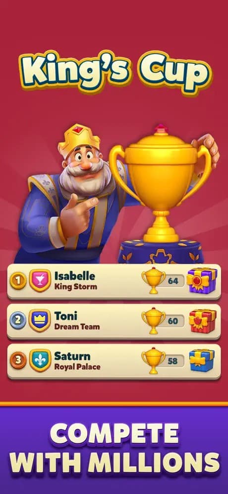 About this game →We have thousands of challenging match-3 levels for you to play in the Royal Arena! On this fun journey, you will solve exciting puzzles, receive coins for unlocking new areas, decorate King Robert’s castle and get extra boosters to continue your saga. Also you can compete with millions of players in events such as King's Cup, Sky Race, Team Battle, Lightning Rush and claim exciting rewards for your achievements. Fun and challenge never ends and you will never have a dull moment in Royal Match.And BOOM! It is 100% ad free and no wifi needed - internet free.Jump into the adventure and play now! We have lots of sweet puzzles to enjoy. Each new episode comes with free coins, helpful boosters, surprising awards, challenging tasks and wonderful areas.- A unique match 3 gameplay and fun levels for both masters and new match 3 players!